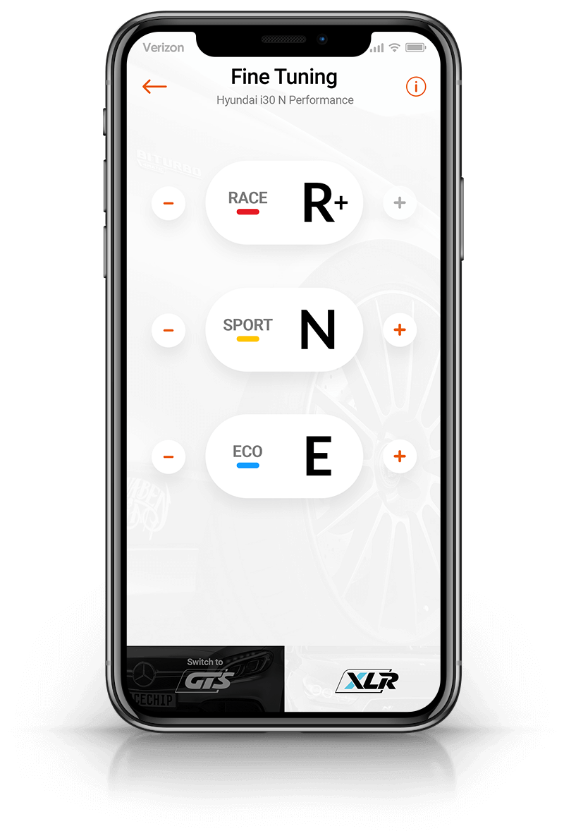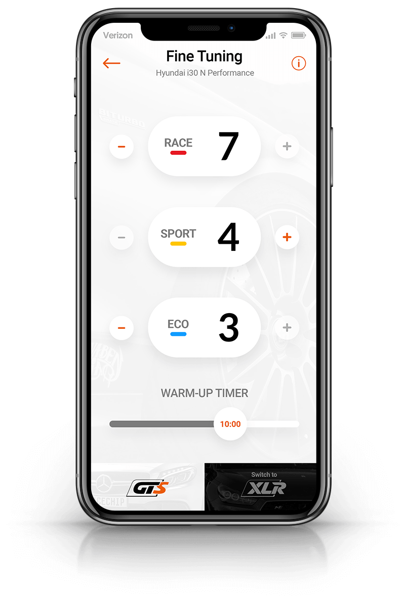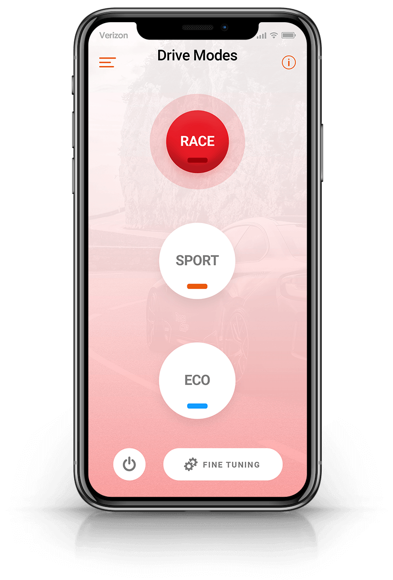 Lors de la livraison, le boîtier est préconfiguré pour votre motorisation. Si ces réglages d'origine ne correspondent à vos attentes, notre service-client a la possibilité d'adapter les paramètres des 3 modes de conduite Efficiency, Sport et Race à la puissance et aux caractéristiques individuelles de votre moteur. Ces nouveaux réglages seront ensuite tout simplement transférés de l'application vers votre boîtier.